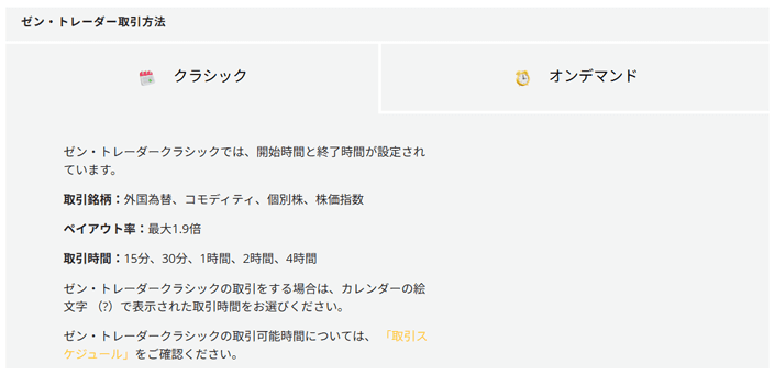 ゼン・トレーダーではオンデマンドとクラシックでは取り扱い銘柄に違いがあります。そのため取引方法別に銘柄を確認しましょう。